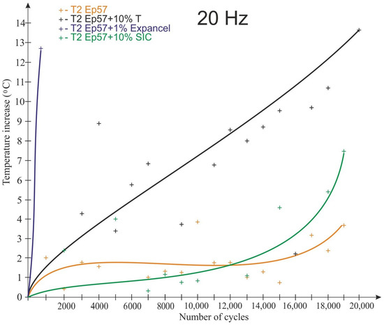 As a result of fatigue loading, some of the samples (with Expancel and Micronal microspheres) failed before the end of the assumed test cycle, which was related to the rapid temperature rise. The remaining samples were not destroyed during the test. The lowest temperature rise (about 3.5 °C) at a load variation frequency of 20 Hz was recorded for Epidian 57/Z-1 without additives. It was registered at ¼ of the sample height (Figure 9). The highest temperature rise (about 14 °C) during the tests was observed for the tungsten-modified samples (also at the same height), despite very good heat dissipation of the tungsten particles that had been expected. It seems that in the case of samples with tungsten powder, this behavior could be the result of a low volume proportion of a filler, the consequence of which was the fact that the particles were not in contact with each other, and they did not conduct heat. The rise in temperature in all the samples was non-linear in its nature. It should also be noted that despite great care being taken to properly prepare and mount the thermocouples in the samples, some thermocouples were damaged during the testing.