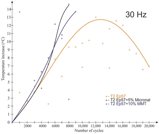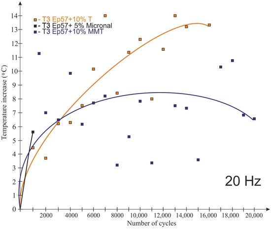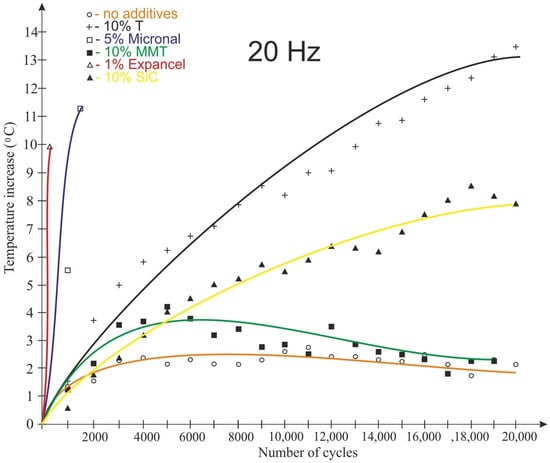 For most materials tested at 20 Hz, an increase in the number of load cycles corresponded to an increase in the temperature of the sample. For a frequency of 30 Hz, another observation was made; namely, after the temperature increased by a certain value, the temperature of the modified samples recorded with a thermal imaging camera decreased.