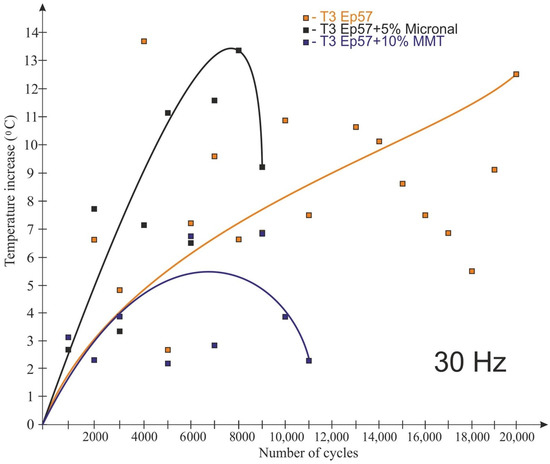 The test results for the frequency of 30 Hz are shown in Figure 11 and Figure 12. The tests conducted at 30 Hz also recorded an increase in the temperature of the examined plastics. Only the samples made of the “pure” composition were not destroyed during the test. Unlike for the 20 Hz tests, the Micronal-modified material had the highest temperature rise, with the highest temperature rise recorded in the ¼ height of the sample (14.4 °C) (Figure 11). In addition, for this material, there was the fastest temperature rise after the start of the test (in the middle of the sample). By far, the lowest temperature rise (T3—in the middle of the sample height) during the test was recorded for the material with the 10% MMT addition, but the sample failed after 11,000 cycles.