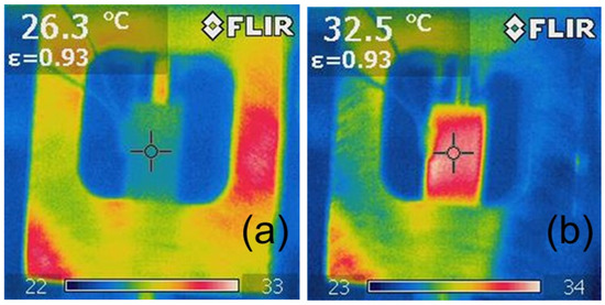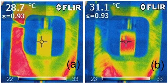 Exemplary thermographic images of samples during testing of Epidian 57/Z-1 +10% W resin after (a) 0 cycles (30 Hz), (b) 14,000 cycles (30 Hz).