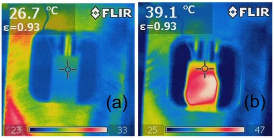 The temperature of the specimen was recorded by two methods during the tests as a function of the number of load cycles. The surface temperature of the sample was observed using thermography [32] and recorded using a Flir IQ60 thermal imaging camera (Teledyne FLIR, Wilsonville, OR, USA).