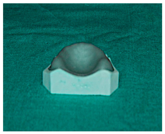 (B) Technique-1—Initially visible light cure sheets were adapted on the cast. Then, a U-shape segment of the adapted VLC sheet was cut along the residual ridge 15 mm below the alveolar crest. The remaining VLC sheet on the cast was then placed in the polymerizing unit for 4 min. The cast was removed from the unit and the cut U-shape segment was replaced on the cast and cured for additional 4 min (Figure 3).