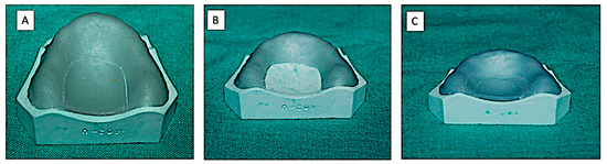 Record Base Fabricated by Technique-1 (Group-B). (A) The cut along the residual ridge 15 mm below the alveolar crest; (B) The remaining VLC sheet on the cast-cured for 4 min; (C) The cut U-shape segment replaced on the cast and cured for additional 4 min.