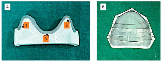 Figure 5. Sectioning & Marking of the Cast & Record Base Assembly (A) Coronal section view (1—right ridge crest; 2—left ridge crest and 3—mid-palate region); (B) Occlusal view.