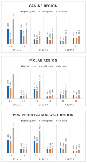The Tukey test showed significantly (p < 0.05 or p < 0.01 or p < 0.001) different and lower dimensional discrepancies in both Group B and Group C as compared to Group A at all sites in both canine and molar regions (except Group A and Group B in mid-palate in the molar region.). Furthermore, at all sites, it also lowered significantly (p < 0.001) in Group C as compared to Group B. Moreover, in posterior palatal seal region, at both the right and left ridge crest, dimensional discrepancy also got lowered significantly (p < 0.001) in Group C as compared to Group B but at mid-palate, it did not differed (p > 0.05) between the two groups, i.e., found to be statistically the same (Table 2, Figure 8).