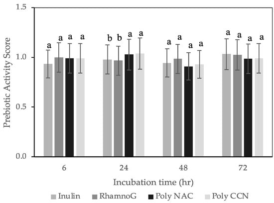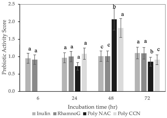 Prebiotic activity scores of Bifidobacterium longum (ATCC® 15707) on polysaccharide extracts, inulin and rhamnogalacturonan, measured at 6, 24, 48, 72 and 96 h of incubation. Values represented as an average ± standard deviation. Poly NAC: polysaccharide NAC variety, Poly CCN: polysaccharide CCN variety, RhamnoG: Rhamnogalacturonan, respectively. For each incubation time, bars with different letters represent scores significantly different at p < 0.05.