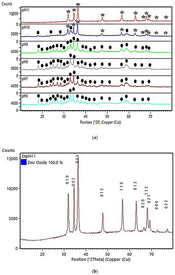(a) XRD spectra of particles formed in the in situ synthesis of ZnO on ND-colored Batik fabric at pH 6–pH 11,