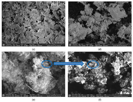 The morphology of the particle formed at various pH is shown by the FESEM image in Figure 3. Figure 3 shows that at pH 6–9, the particle is in the form of a flake, which is a lamellar compound called Pentazinc Octahydroxide Bis nitrate V Dihydrate. The shape of the flake-like material is in accordance with the research of Koao et al. [39], who synthesized ZnO using Zn acetate and ammonia precursors. Figure 3e,f show the transformation of the ZnO particles between pH 10 and pH 11. At pH 11 (Figure 3f) pure ZnO formed in the shape of a nanorod. Based on the analyzed XRD and FESEM data, we hypothesized that, in our experimental range, the most suitable conditions for the in situ formation of ZnO NPs on ND-colored fabric would be at 50 °C and at pH 11 in a CBD.