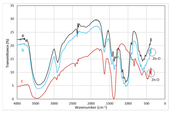The interaction between the ZnO NPs and the cellulosic chains of cotton fabric (Batik fabric) was analyzed using FT-IR. Figure 5 demonstrates the FT-IR spectra of untreated (Figure 5a), ZnO NPs-treated ND-colored Batik fabric (Figure 5b), and ZnO NPs powder (Figure 5c). The bands of untreated fabric appear at 3410 cm−1 (O-H stretching), 2900 cm−1 (C-H stretching) [40], 1635 cm−1 (C=O stretching), 1427 cm−1 (C-H wagging), 1319 cm−1 (C-H bending) [22], and 1026 cm−1 (C-O stretching vibration) [41]. Compared to the spectra of untreated fabric, Figure 5b shows that the band at 2900 cm−1 shifted to 2916 cm−1, indicating that C-H was affected by other chemical bonds. The band at 1026 cm−1 shifted to 1033 cm−1, indicating that C-O was also affected by other chemical bonds. Figure 5b shows bands below 500 cm−1, which can be attributed to Zn-O bonds [22,41], as indicated by Figure 5c.