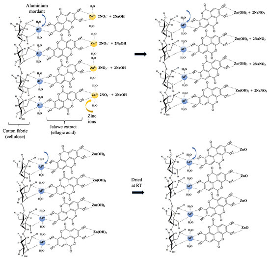 The mechanism for the synthesis of ZnO NP in situ on the cellulose chain of cotton fabrics is divided into three main stages: pre-nucleation, nucleation, and growth [40]. The pre-nucleation stage occurs when the cellulose of cotton cloth is stirred in a Zn salt solution. Zn2+ ions will be dispersed in the solution. ND-colored cellulose cotton fibers produce a slightly negative charge on the surface due to the ionization of hydroxyl groups when immersed in water. Zinc ions with a positive charge can absorb into the cotton fibers due to coordination bonding, forming a Zinc–Cellulose complex [42]. Similarly, Zinc ions can also form coordination bonding with the ND molecules that are attached to the cellulose fibers, forming a Zinc–ND complex (Figure 6). It is known from the literature [43] that the active compound of Jalawe extract is ellagic acid. Furthermore, heterogeneous nucleation theory stipulates that the nucleation energy barrier is lowered on a surface if attractive forces exist between the surface and (at least one type of) the building blocks [44]. The ND-colored cotton surface attracts Zn2+ ions, which, in turn, attract the OH− ions and form the nucleus for ZnO crystals [42], as shown in Figure 6.