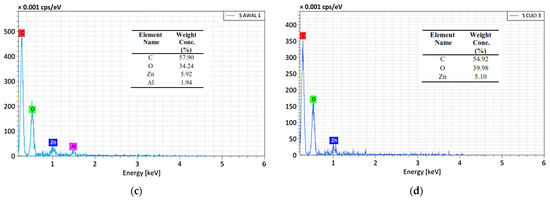 From the EDX analysis (Figure 10c,d), it can be seen, quantitatively, that the concentration of ZnO NPs before washing was 5.92% and after washing it was reduced to 5.10%, which corresponds to the removal of 16% of the ZnO NPs. Thus, 84% of the ZnO NPs remained on the Batik fabrics after washing, demonstrating a sufficient durability of their attachment to the fabrics [56]. In our previous study, we found that the durability of the antibacterial properties of ZnO NPs in in situ treated Batik fabrics was equivalent to more than 35 cycles of home laundering [26].