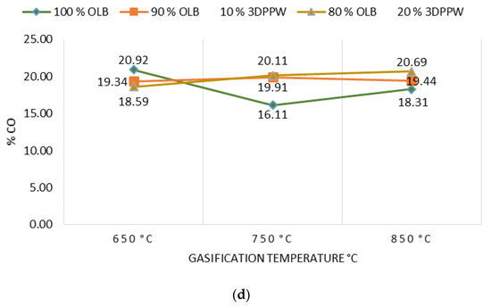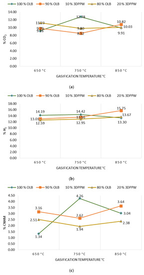 In a perfect gasification system, and according to the Le Chatelier principle, in endothermic reactions the temperature value marks obtained products. In a gasification process, an increase in temperature means an increase in CO and H2 levels of obtained syngas and a decrease in temperature means higher levels of CO2 and CnHm [42,43,44,45,46,47]. In 10% and 20% 3DPPW mixtures, this phenomenon is observed for temperatures of 650 °C and 750 °C. For every mixture, we consider extreme tests those at 850 °C of temperature, because tests were performed at the limit of good performance of the gasification device.