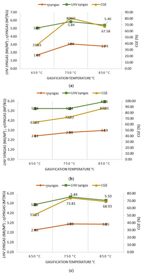For 100% OLB, 90% OLB and 10% 3DPPW, and 80% OLB and 20% 3DPPW fuel compositions, obtained syngas characteristics were analyzed in terms of LHV, CGE, and ɳsyngas for different temperatures of gasification, as shown in Figure 3a–c.