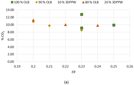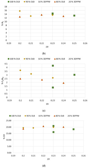ER influence on molar fraction of gases which form the produced syngas are presented in Figure 4a–d.