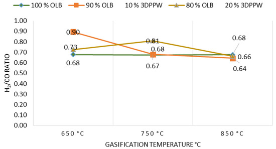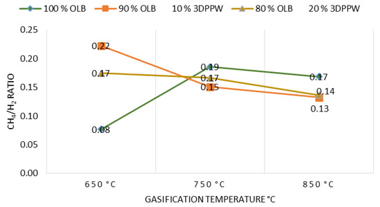 Figure 5 shows that CH4/H2 ratio tends to decrease when temperature increases, except for 100% OLB fuel. This means an increase in gasification temperature tend to increase H2 concentration. Additionally, as a result of thermal cracking reactions, with a gasification temperature increase tends to decrease CH4 concentration. At 750 °C gasification temperature or higher, results of gasification raw materials become more similar. This fact is explained by the constant decrease in CH4 concentration for this temperature range. H2 concentration is less pronounced too [34].