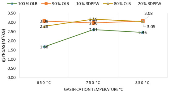A gasification temperature increase from 650 °C to 750 °C improves syngas performance for every performed test, as, under these temperature conditions, thermal cracking reactions and Boudouard reactions happen more often. The 90% OLB, 10% 3DPPW mixture fuel presents the same behavior at 850 °C too [50]. However, a gasification temperature increase to 850 degrees Celsius produces a little decrease in syngas performance for the 100% OLB and the 80% OLB, 20% 3DPPW mixtures. This situation is related to Gibbs free energy and the Boudouard reaction, because CO concentration tends to remain stable and, furthermore, there is a higher creation of by-products, chars and tars, meaning it cannot complete its transformation into syngas during the gasification process at 850 °C.