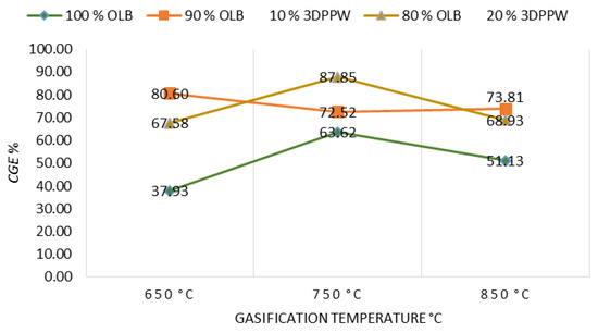 LHV increase and higher syngas performance mean a CGE improvement for all mixtures used as fuels. The maximum percentage obtained is presented by 90% OLB, 10% 3DPPW mix at 850 °C of gasification temperature, and this value is 87.85%. For the 100% OLB and 80% OLB, 20% 3DPPW fuels, the highest values of CGE are 80.60% and 73.81%, respectively, at 750 degrees Celsius of gasification temperature.