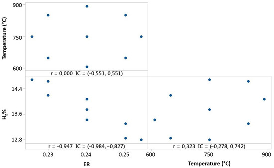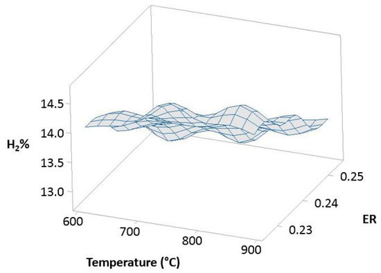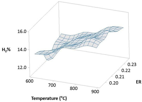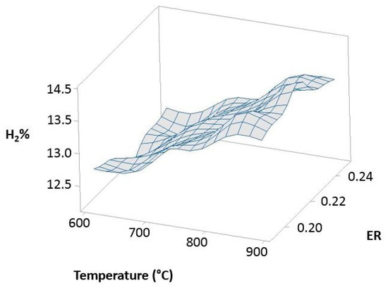 An empirical mathematical model has as its objective of study the concentration of hydrogen in syngas. This is based on gasification temperature and efficiency ratio (ER). This model is defined in Equation (5).