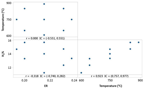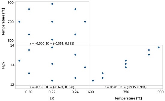 Initial analysis shows that an ER increase affects N2 content. When ER increase, when air is used as the oxidant agent, the obtained syngas has a higher level of dissolution in nitrogen, so the resultant syngas has minor heating power. The H2 and CO increase is explained by reaction temperature increment. A higher oxidant agent flow rate favors exothermal reactions and, consequently, thermal cracking reactions produce higher concentrations of CO and H2. ER has a negative effect on CnHm content. Thermal cracking reactions are increased due to higher temperatures and this causes a decomposition of methane [54]. H2 and CO concentration promotion do not favor an increase in combustion reactions. Therefore, CO2 formation is not notorious.