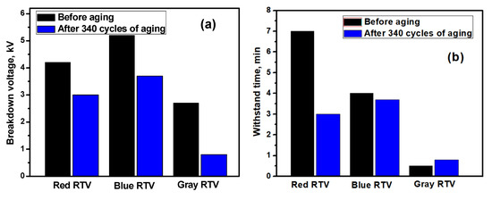 - Yang, H.; Wen, R.; Zhao, H.; Guo, M.; Zhang, L.; Chen, Y. Study on ageing characteristics and evaluation methods of RTV silicone rubber in high humidity area. PLoS ONE 2021, 16, 0251092. [Google Scholar] [CrossRef]