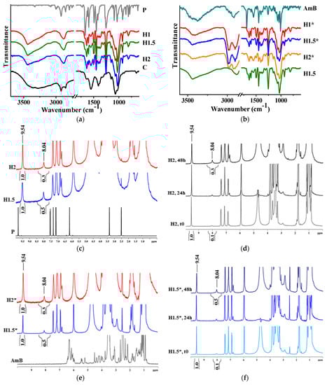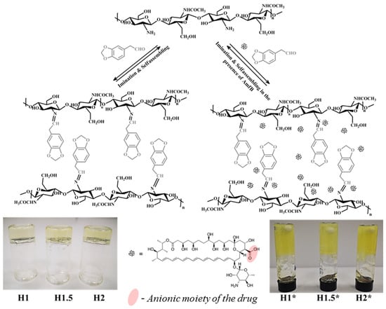 A series of three hydrogels (H1, H1.5 and H2) and three formulations (H1*, H1.5* and H2*) were synthesized by the imination reaction between C and P monoaldehyde, followed by the self-assembling of the formed imine units in the absence or presence of AmB antifungal drug (Table 1). The systems were based on a rational design strongly related to the structural particularities of the components—the polycationic chain of chitosan and the anionic character of AmB which should facilitate drug-matrix interactions, and also to the structural similarities between the components: both chitosan and AmB presenting multiple hydroxyl groups which should facilitate the formation of hydrogen bonds between the drug and the polymeric matrix [,]. The hydrogelation consisted in the obtaining of the piperonyl-iminochitosan derivatives, followed by their selfassembling in the presence or absence of the AmB drug (Scheme 1). The hydrogelation occurred faster in the case of the reference hydrogels, compared to the DDSs, very probably because of the presence of Amphotericin B which is a drug with a large molecule and may hamper the selfassembling of the piperonyl-iminochitosan derivatives, leading to longer hydrogelation times. This being said, it can be concluded that through this rational design are fulfilled some mandatory requirements for the development of sustained release drug delivery systems.