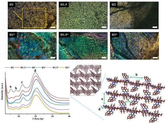 Diffractograms of the reference xerogels and formulations and POM images for the reference hydrogels and the formulations (scale bar 50 µm) (a, b, c, d represent the diffraction peaks and the corresponding d-spacings from the Bragg’s law). The regions indicated with arrows indicate strong birefringence.