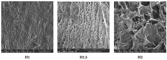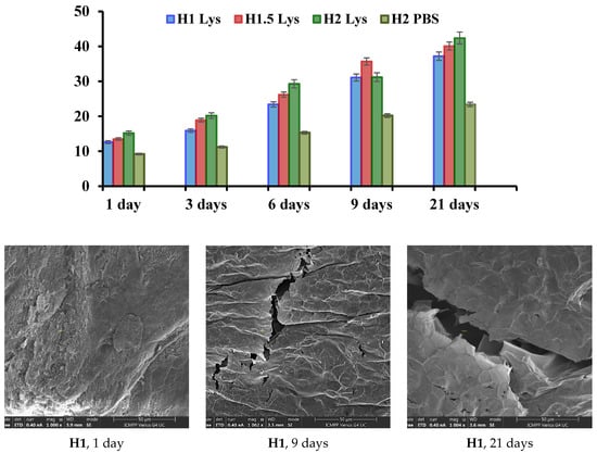 The absence of matrix accumulation into the body is an important parameter which must be taken into consideration in the development of new drug delivery systems []. Therefore, the samples were evaluated from the point of view of their hydrolytic and enzymatic degradability. The experiments were done gravimetrically by determining the mass loss of the samples and from the morphological point of view by SEM. The results showed a positive influence of the enzyme on the degradability rate and extent, the presence of lysozyme leading to higher values of the mass loss, with a maximum of 42% for the H2 sample compared to 23.4% in its absence (Figure 5). This can be explained by the larger pores of this sample and also the looseness of the network in comparison with the other samples, which allowed an easier diffusion of the enzime. Therefore, the hydrogels proved to be highly and rapidly biodegradable in the presence of lysozyme, making them suitable from bioapplications.