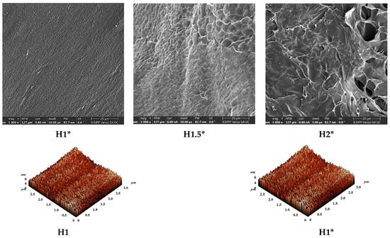 In order to obtain the hydrogels in dried state, further called xerogels, the samples were freeze-dried using a LABCONCO FreeZone FreezeDry System (Canada), at −54 °C and 1.510 mbar, for 24 h. The FTIR spectra of the starting materials (C, P, AmB), of the reference xerogels (H1, H1.5 and H2) and formulations (H1*, H1.5* and H2*), were recorded on a FTIR Bruker Vertex 70 Spectrophotometer (Ettligen, Germany), with a ZnSe single reflection ATR accessory. The NMR spectra were recorded on a Bruker Avance DRX 400 MHz Spectrometer (Bruker, Germany) equipped with a 5 mm QNP direct detection probe and z-gradients on samples prepared directly in deuterium oxide. The supramolecular architecture of the synthesized systems, hydrogels and formulations, was evaluated by polarized optical microscopy on a Leica DM2500 microscope, (Hamburg, Germany) and by X-ray diffraction on a Rigaku Miniflex 600 diffractometer using CuKα-emission in the range 2–40° (2θ) with a scanning step of 0.0025° and a recording rate of 1°/min. The morphology was evaluated using a Scanning Electron Microscope SEM EDAX—Quanta 200 (Eindhoven, Germany) on xerogels. Atomic force microscopy (AFM) was performed using a Ntegra Spectra Instrument (NT-MDT, Russia) in the semi-contact mode, at room temperature and using a silicon cantilever (NSG 10) on hydrogel samples deposited on mica.