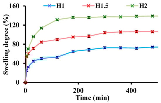 To have an insight regarding the behavior of the hydrogels in the physiological medium, their swelling behavior was monitored in PBS solution of physiological pH. The obtained data revealed that the samples swelled with different ratios depending on the density of the piperonyl units on chitosan chain (Figure 4). Therefore, the H1 sample reached a maximum swelling degree of 106%, while the sample H2 led to a maximum value of 140% (Figure 4). All the samples, regardless the piperonal content, reached the maximum swelling degree in ~300 min.