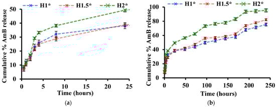 The sample H1*, which is characterized by the most numerous hydrophobic imine clusters which act as crosslinking nodes, released the encapsulated drug with the slowest rate, in 24 h releasing 38% from the total encapsulated amount. On contrary, the sample H2* released the drug faster, due to the looser network, which allowed the sample swelling and therefore drug’s dissolution, in 24 h releasing 49% from the total AmB amount (Figure 6).