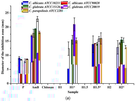 All the data proved that between the drug and the matrix there are strong interactions. Therefore, in order to evaluate if these interactions influence in a negative manner the antifungal activity of the drug, the hydrogels were evaluated on five Candida strains and the diameter of the inhibition zone was measured. The tests were done on hydrogels, formulations and their components of similar concentration as they are into the hydrogels. The obtained data are presented in Figure 7. Even if C was reported in the literature as presenting antifungal and antibacterial properties, this fact was not confirmed by this study, very probably because of differences between chitosan batches such as molecular weight and deacetylation degree, these two parameters being the ones which mostly influence its properties. AmB presented the standard antifungal activity for the tested concentration [] and was efficient against all the tested yeast strains, being known that its mechanism of action consists in the fact that its molecule binds to the ergosterol in the fungal cell membrane, forming an aggregate that opens a transmembrane channel, causing the cytoplasmic contents to flow out and ultimately causing cell death. Piperonal nitro derivatives are also known to have antifungal activity against Candida species []. In this case, the tested concentration of P monoaldehyde had a small antifungal activity against 4 of the tested strains.