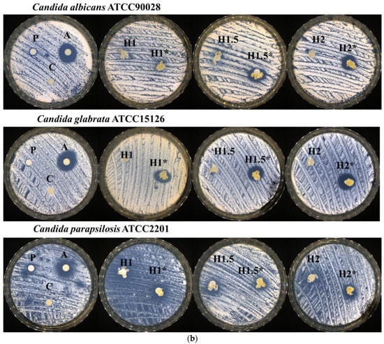 The reference hydrogels didn’t present any antifungal activity, while the formulations were quite efficient against the tested strains, the most promising results being obtained in case of C. glabrata ATCC20019 (up to 23 mm of inhibition zone for H1* sample). The activity of the other two samples was similar one to another, revealing the fact that at 24 h during the experiment there is no significant difference in the amount of AmB released from the two different hydrogels.