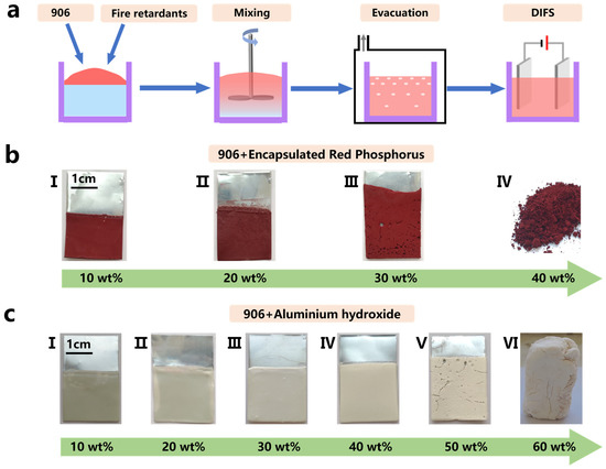 (a) Flow chart of the preparation of flame-retardant coating on the metal surface via the DIFS method; (b) the flame-retardant coating prepared through the mixing of RP and ATH at different proportions; (c) the mixed state.
