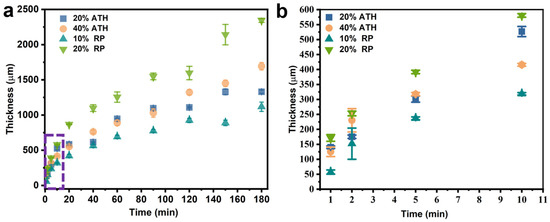 (a) The relationship between film thickness and preparation time of the emulsion with different flame retardant concentrations at 2 V; (b) the relationship between film thickness and preparation time in the first 10 min.