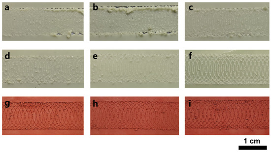 The change in the coating adhesion when samples were dried at room temperature and under different drying times. ATH 20 wt.% drying time: (a) 7 days, (b) 14 days, (c) 21 days, (d) 28 days, (e) 35 days, (f) 90 days; RP 20 wt.% drying time: (g) 3 days, (h) 6 days, (i) 14 days.
