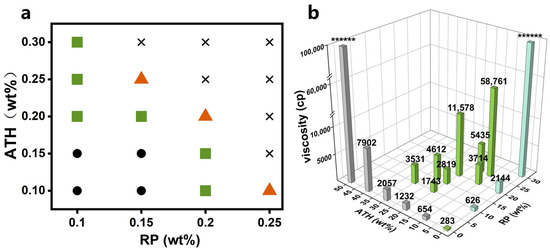 (a) The green square represents the range of emulsions with good film-forming properties; the orange triangle represents the mixed emulsions with cracks on the film surface; the cross represents the emulsions that are speculated to be unable of forming a good film; the circle represents the emulsions that are speculated to be able to form a good film; (b) Viscosities of the emulsions with different flame retardant concentrations. Gray represents the emulsion viscosity after mixing ATH alone into 906 emulsion, green represents the emulsion viscosity after mixing RP and ATH into 906 emulsion, blue represents the emulsion viscosity after mixing RP alone into 906 emulsion.