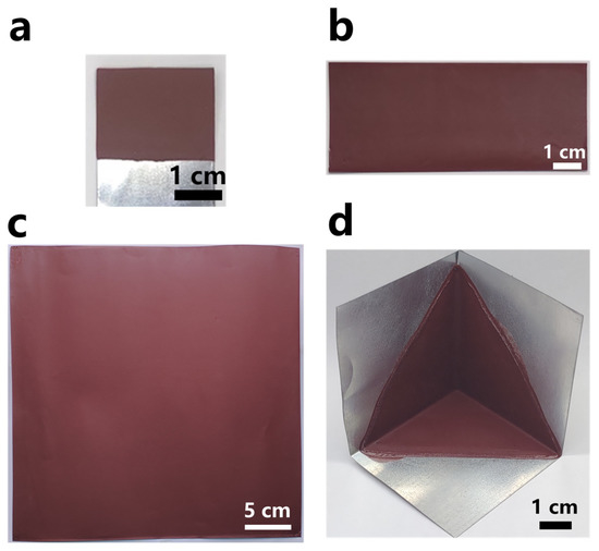 Film formed using ATH 20 wt.% + RP 10 wt.% mixed emulsion (a–c); planar film formed on areas of different sizes; (d) film formed at non-planar corners.
