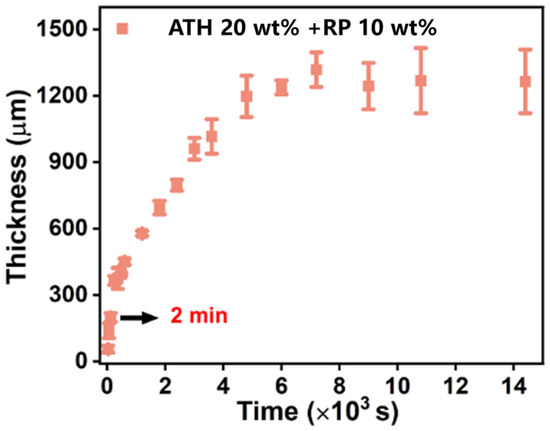 Similar to the film thickness of the single-component flame-retardant coating in Figure 2, the mixed emulsion under the selected conditions had a relatively fast film-forming speed (Figure 6), and a coating with the desired thickness could be prepared within a short time. The coating of this mixing ratio possessed good mechanical properties, combining the good flame retardancy properties of ATH and the good adhesion properties of RP (Table 3). After multiple tests, as shown in Figure 7, the LOI value was 30.4%.