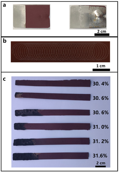 The flame-retardant paint was prepared through the addition of a flame retardant to a polymer substrate. The RE–906 PUA tackifier emulsion was selected as the polymer substrate because the emulsion has been industrially prepared on a large scale, and purchasing large quantities can substantially reduce preparation costs. The selected flame retardants were RP and ATH. As shown in Figure 1, flame retardants were added to the 906 emulsion, and both materials were mixed according to different mass percentages to determine the optimum mixing ratio. At a too-high viscosity of the mixed emulsion, the internal bubbles could not be self-eliminated, and DIFS-based demulsification and film formation could cause voids and depressions on the coating surface. To ensure the quality of film formation, it was necessary to pump down to create a negative pressure in a closed container, to eliminate the bubbles generated during the mixing process. The time to maintain the negative pressure was adjusted according to the viscosity of the mixed emulsion and the concentration of bubbles, to avoid deteriorating the coating morphology. The 906 emulsion–flame retardant mixture was introduced into a beaker, and zinc sheets were used as the anode and cathode. The area of the electrode sheet was selected as 2 cm × 3 cm, and the depth of the electrode sheet immersed in the emulsion was 2 cm. The sheets were placed parallel to each other at a distance of 1 cm. A voltage of 2 V was stably applied by a DC-regulated power supply, and the time to maintain the voltage in the film-formation stage was uniformly selected as 10 min. After the power was turned off, the cathode sheet was taken out, the emulsion attached to the surface was slowly rinsed with water, and finally, a flame-retardant coating was obtained on the metal surface. The initial flame retardant (RP, ATH) mixing ratio was 10 wt.%, and the mixing ratio was increased at intervals of 10 wt.% to test the film-forming properties until the film could not be formed. The results are shown in Figure 1b,c. The maximum RP and ATH concentrations were 20 wt.% and 40 wt.%, respectively. Under the above concentrations, the flame-retardant coating was smooth, without depressions, and formed a good DIFS film. A continuous increase in the concentration led to defects in the coating. Excessive solid content reduced the overall viscosity and eventually led to the failure of direct solidification in the emulsion, so that DIFS could not proceed, and the film could not be formed (Figure 1b IV and Figure 1c VI).