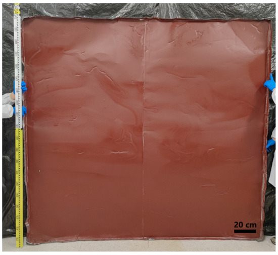 After determination of the mixing ratio of flame retardants and the film formation test of metal sheets of different shapes and areas, to reduce the cost of large-scale industrial applications and the difficulty of obtaining raw materials, galvanized iron sheets, instead of zinc sheets, were used to prepare flame-retardant coatings. Two 1.2 m × 2 m metal sheets were spliced to prepare a large-area galvanized iron sheet, and the flame-retardant coating was prepared via the DIFS method. A 2 m × 2.2 m large-area flame-retardant coating was prepared, as shown in Figure 8.