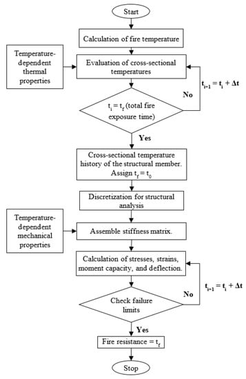 Flowchart outlining the steps used in the numerical model for evaluating the fire resistance of FRP-strengthened RC members.