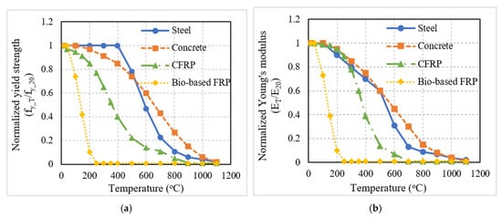 Figure 2 shows the degradation of strength and elastic modulus of concrete, steel rebar, conventional FRP (CFRP), and bio-based FRP. It can be seen that the reduction in strength and stiffness of the FRP material was more rapid when compared to concrete and reinforcing steel. Bio-based FRP experienced an even more drastic reduction as compared to conventional FRP. The critical temperature for the conventional FRP composite is defined as the temperature at which the FRP loses 50% of its strength [16]. For instance, the critical temperature for CFRP and GFRP, used in strengthening applications are 250 °C and 325 °C, respectively [16]. On the other hand, for the bio-based FRP assumed in this study, the critical temperature was 150 °C.