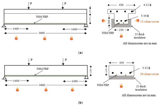 Beams B1 and B2 were provided with two NSM CFRP strips with a cross-sectional size of 13.5 mm × 4.5 mm, whereas beams B3 and B4 were provided with five NSM bio-based FRP strips 20 mm × 10 mm in size each. Additionally, beams B1 and B3 were uninsulated, whereas beams B2 and B4 were provided with 25 mm U-shaped SFRM-type fire insulation (Figure 3). Similar to the T-beams, two slabs (S1 and S2) were provided with two CFRP strips each while the other two slabs (S3 and S4) are each provided with four bio-based FRP strips (Table 2). In addition, the insulation scheme was varied such that slabs S1 and S3 were uninsulated whereas slabs S2 and S4 were insulated with 25 mm fireproofing material near the bottom surface.