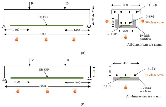 For members with EB FRP reinforcement, the FRP type and insulation scheme were varied similar to the NSM FRP beams and slabs as shown in Table 3. CFRP-type strengthening was provided on two beams (B5 and B6) and two slabs (S5 and S6), whereas bio-based FRP-type strengthening was applied on the other two beams (B7 and B8) and two slabs (S7 and S8). The EB FRP reinforcement was selected to achieve a 25% increase in moment capacity in all beams and slabs considered in this case. No fire protection was provided on four of the beams and slabs (B5, B7, S5, and S7). The other four members (B6, B8, S6, and S8) were provided with 19 mm fire insulation as shown in Figure 4.