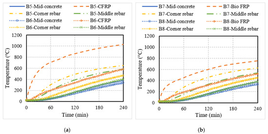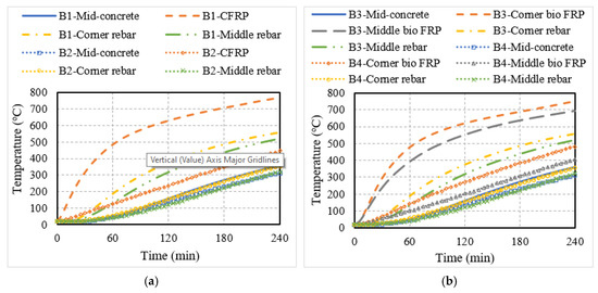 To investigate the fire performance of RC members strengthened with externally bonded (EB) FRP reinforcements, eight different configurations of beams and slabs were analyzed. The temperatures obtained from the thermal analysis for concrete (at mid-depth), steel rebar, and FRP are plotted for the different flexural members in Figure 9. In comparison to the NSM FRP-strengthened members, the EB FRP reinforcement experienced higher temperatures since the FRP is externally applied to the member in the latter case and hence, is in closer proximity to the fire exposure. For this reason, the EB FRP reinforcement reached the critical temperature more quickly than the NSM reinforcement. For instance, in the case of the bio-based FRP-strengthened members, the time taken to reach the critical temperature was 5 min for uninsulated members and 45 min for insulated members.