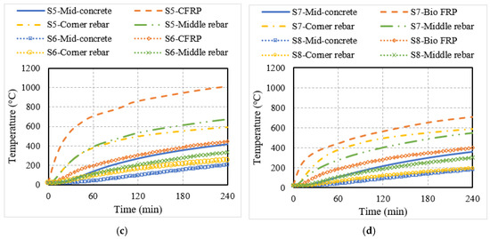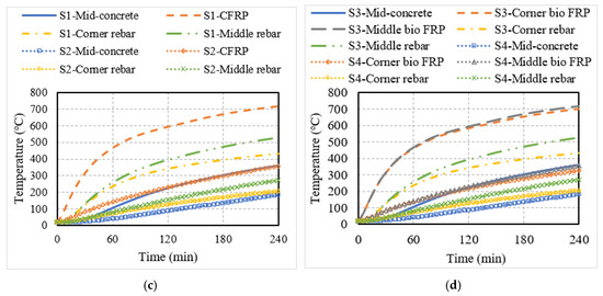 Thermal response of RC members strengthened with conventional or bio-based EB FRP reinforcement. (a) EB CFRP-strengthened T-beam; (b) EB bio-based FRP-strengthened T-beam; (c) EB CFRP-strengthened slab; (d) EB bio-based FRP-strengthened slab.