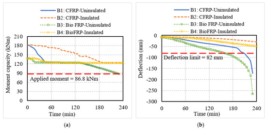 From Figure 9, it can also be seen that the temperatures in the bio-based FRP reinforcement were lower than that of the CFRP reinforcement, especially in the case of uninsulated members. This is because the temperature in the FRP was measured at the mid-height and the thickness of the bio-based FRP (10 mm) which is larger than the CFRP strip (1 mm), which in turn results in a slower transfer of heat in the bio-based FRP. However, in uninsulated members, the FRP is likely to disintegrate early during fire exposure since they are combustible and will not contribute much to the fire resistance of the member. Further, the steel rebar temperatures increased beyond the critical temperature of 593 °C in the later stages of fire exposure (around 180 min) in the uninsulated flexural members, indicating failure based on the critical temperature limit state. However, for a more realistic evaluation of fire performance, the structural response of the FRP-strengthened RC members was traced under fire exposure.