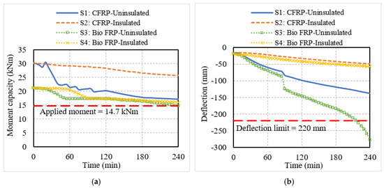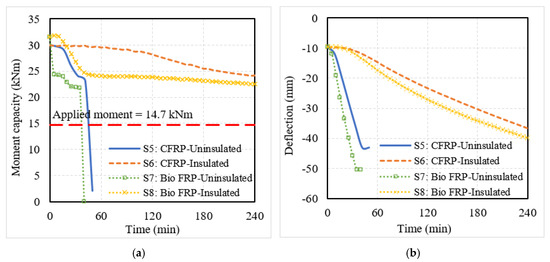 The structural response of the NSM FRP-strengthened beams and slabs was monitored through the degradation in moment capacity and mid-span deflection of the structural members, which are shown in Figure 7 and Figure 8. In the flexural members with no fire protection, the moment capacity decreased rapidly in the initial phase of fire exposure. This is because the NSM strips experienced a significant rise in temperature due to their proximity to the fire-exposed surfaces of the flexural members. In comparison to the CFRP-strengthened members, the moment capacity degradation in the bio-based FRP members was more rapid owing to the faster degradation of the strength and stiffness properties of the bio-based FRP with temperature. This can be seen from the response of beam B3 and slab S3, which lost their entire strengthening contribution at 20 min and 50 min, respectively, as compared to the CFRP beam B1 and slab S1 which lost their strengthening contribution at 90 min and 120 min, respectively. After losing their strengthening, the flexural members behaved as conventional RC members without much contribution from the CFRP or bio-based FRP reinforcement. With a further increase in fire temperature, the moment capacity of the uninsulated members began to gradually degrade but did not drop below the corresponding applied moments in the beams and slabs, indicating that the failure did not occur due to strength criteria.