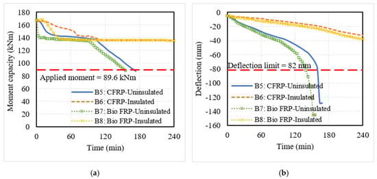 The fire-insulated conventional and bio-based NSM FRP-strengthened members performed better under fire exposure. The fire insulation prevented the FRP reinforcement from experiencing a rapid increase in temperature, and hence the flexural members can retain their strengthening levels for a longer duration of fire exposure. This can be seen from the more gradual decrease in moment capacity and deflection of the insulated members in comparison to the uninsulated members in Figure 7 and Figure 8. Although the presence of fire insulation delayed the loss of strengthening in the bio-based FRP-strengthened members, beam B4 and slab S4 lost their strengthening faster at 55 min and 90 min, respectively, compared to the CFRP-strengthened members, which did not lose their strengthening until 180 min or longer. This is because the initial strengthening levels were higher in the case of CFRP-strengthened members and in addition, the bio-based FRP tended to lose its strength and stiffness faster compared to CFRP. The moment capacity and deflection of the insulated flexural members were above the respective limits and hence, these members did not undergo failure within the 240 min of fire exposure.