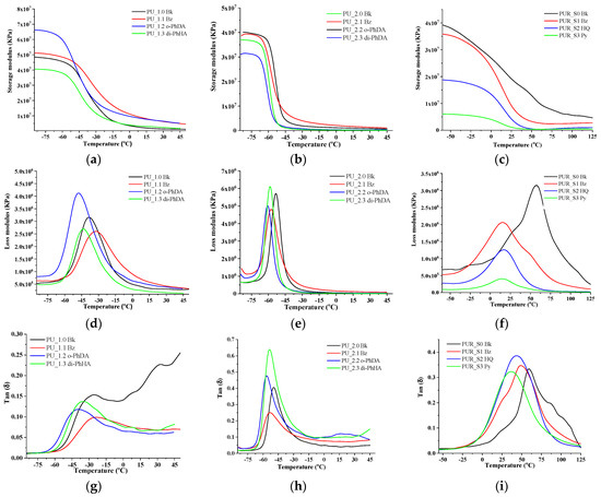 Storage modulus (a–c), loss modulus (d–f), and tan delta (g–i) of PU and PUR films.